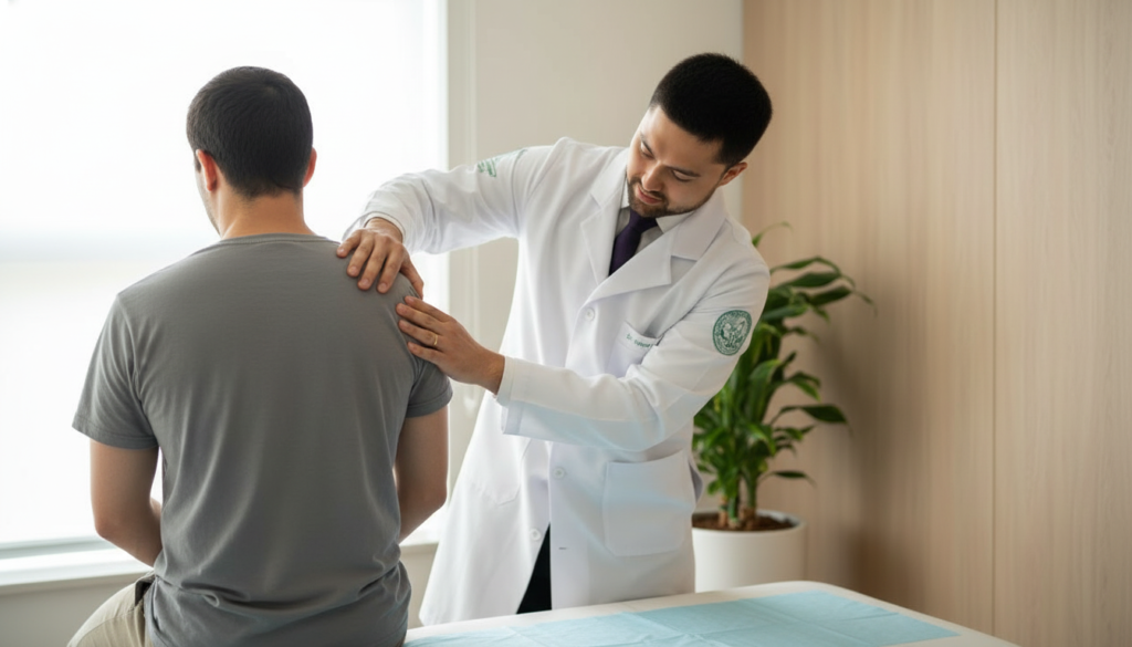 O diagnóstico da dor no ombro começa com uma consulta detalhada. Primeiramente, o Dr. Henry Fukuda realiza uma anamnese completa — avaliando o histórico do paciente, as características da dor, as atividades que a pioram e os sintomas associados. Em seguida, é realizado o exame físico, com testes específicos para cada estrutura do ombro.